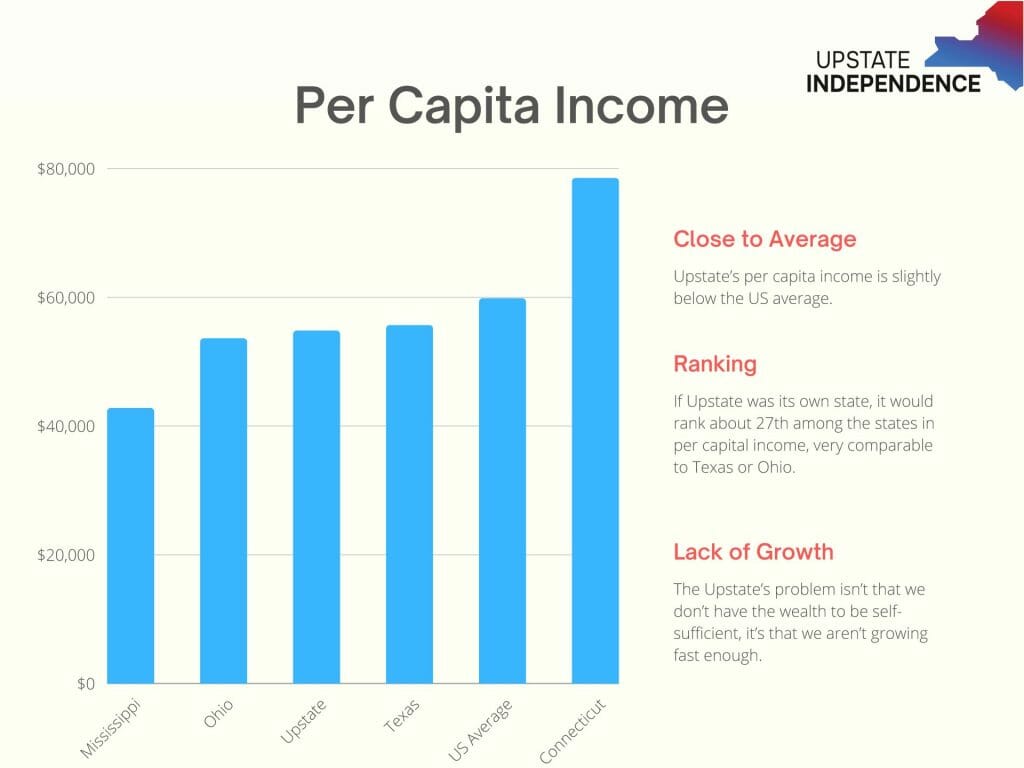No doubt that Upstate has much room to improve as we are below the national per capita income of $59,765, but it’s completely false that Upstate does not have the economic base to support itself when states with similar income levels (including Florida, Wisconsin, Maine, and Nevada) function just fine. I would also add that each of these states is likely in a much better fiscal position than New York State and does not run massive structural deficits.