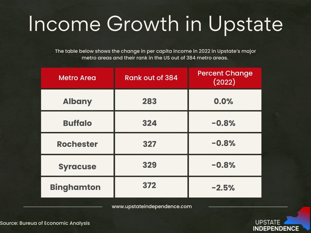The performance of most of Upstate’s major metro regions should be an embarrassment for New York State and local officials. Albany’s per capita income remained stagnant at 0.0%, while Buffalo, Rochester, and Syracuse all experienced dismal results. Buffalo and Rochester’s per capita income both contracted by 0.8%, and Syracuse declined by 0.9%. Binghamton saw a catastrophic decline of 2.5% in 2022.